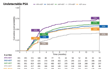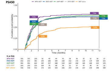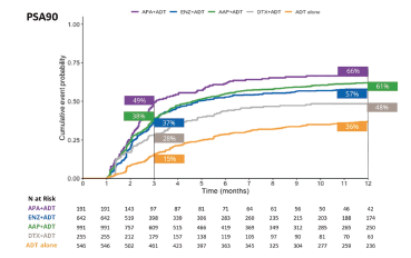 Aos 3 meses, as taxas de resposta PSA50, PSA90 e PSA indetectável foram, respectivamente: 70%, 49% e 44% para apalutamida + ADT; 60%, 38% e 32% para enzalutamida + ADT; 59%, 37% e 33% para abiraterona + ADT; e 32%, 15% e 20% para ADT isolada.