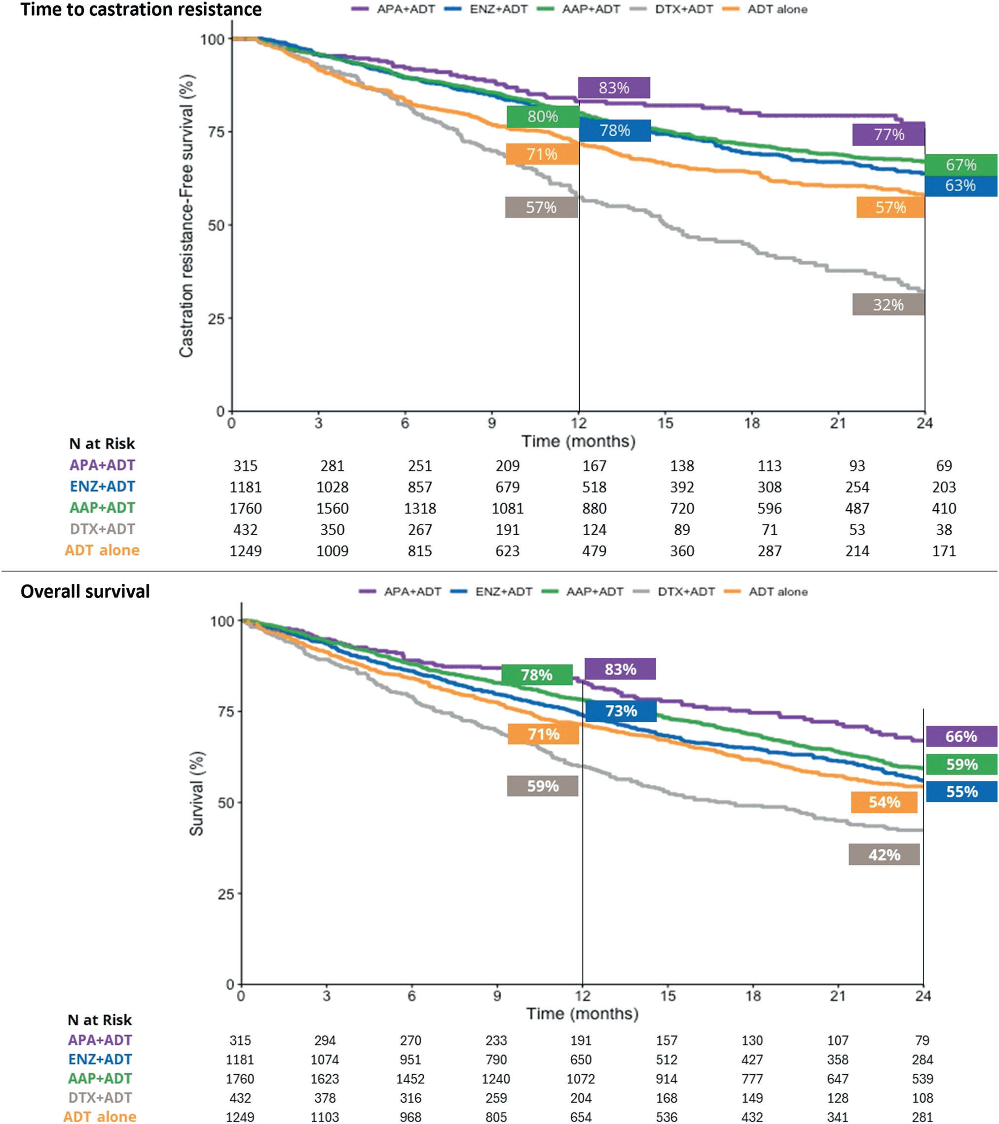 A sobrevida global em 24 meses foi de 66% com apalutamida + ADT, comparada a 55% (enzalutamida + ADT), 59% (abiraterona + ADT), 42% (docetaxel + ADT) e 54% (ADT isolada). A combinação de apalutamida + ADT reduziu significativamente o risco de morte em relação a todos os outros grupos: HR 0,66 versus enzalutamida + ADT (IC95% 0,51–0,87), HR 0,72 versus abiraterona + ADT (IC95% 0,55–0,94), HR 0,38 versus docetaxel + ADT (IC95% 0,28–0,52) e HR 0,64 versus ADT isolada (IC95% 0,49–0,84). O tempo até resistência à castração também foi mais prolongado para apalutamida + ADT, com HR 0,68 versus enzalutamida + ADT e HR 0,40 versus ADT isolada.
